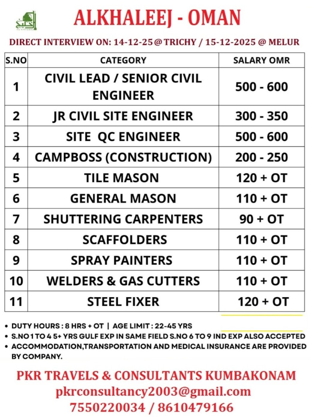 RQUIREMENT FOR ABU OMAN Engineering/Construction/Fabrication/Real Estate Oman 2025-12-11 Application ends: 2025-12-16 Apply Now Apply for this job Upload CV (doc, docx, pdf) You accept our Terms and Conditions and Privacy Policy Apply Job Job Overview Date Posted 2025-12-11 Location Oman Expiration date -- Experience 5 Year Job Description SEND ME UR CVS pkrconsultancy2003@gmail.com Share this post Facebook Twitter LinkedIn Pinterest Photos Related Jobs MEP TECHNICIAN Engineering/Construction/Fabrication/Real Estate United Arab Emirates (UAE) REQUIRED FOR A CONSTRUCTION COMPANY IN ABUDHABI CLIENT INTERVIEW 17.12.2025 AT CHENNAI & 18.12.2025 AT TRICHY Engineering/Construction/Fabrication/Real Estate Abu Dhabi URGENT REQUIREMENT FOR A LEADING BUILDING CONSTRUCTION COMPANY IN SHARJAH (UAE) DIRECT CLIENT INTERVIEW IN TRICHY & CHENNAI @ SOON Engineering/Construction/Fabrication/Real Estate Sharjah OMAN GULFAR VACANCY Engineering/Construction/Fabrication/Real Estate Oman
