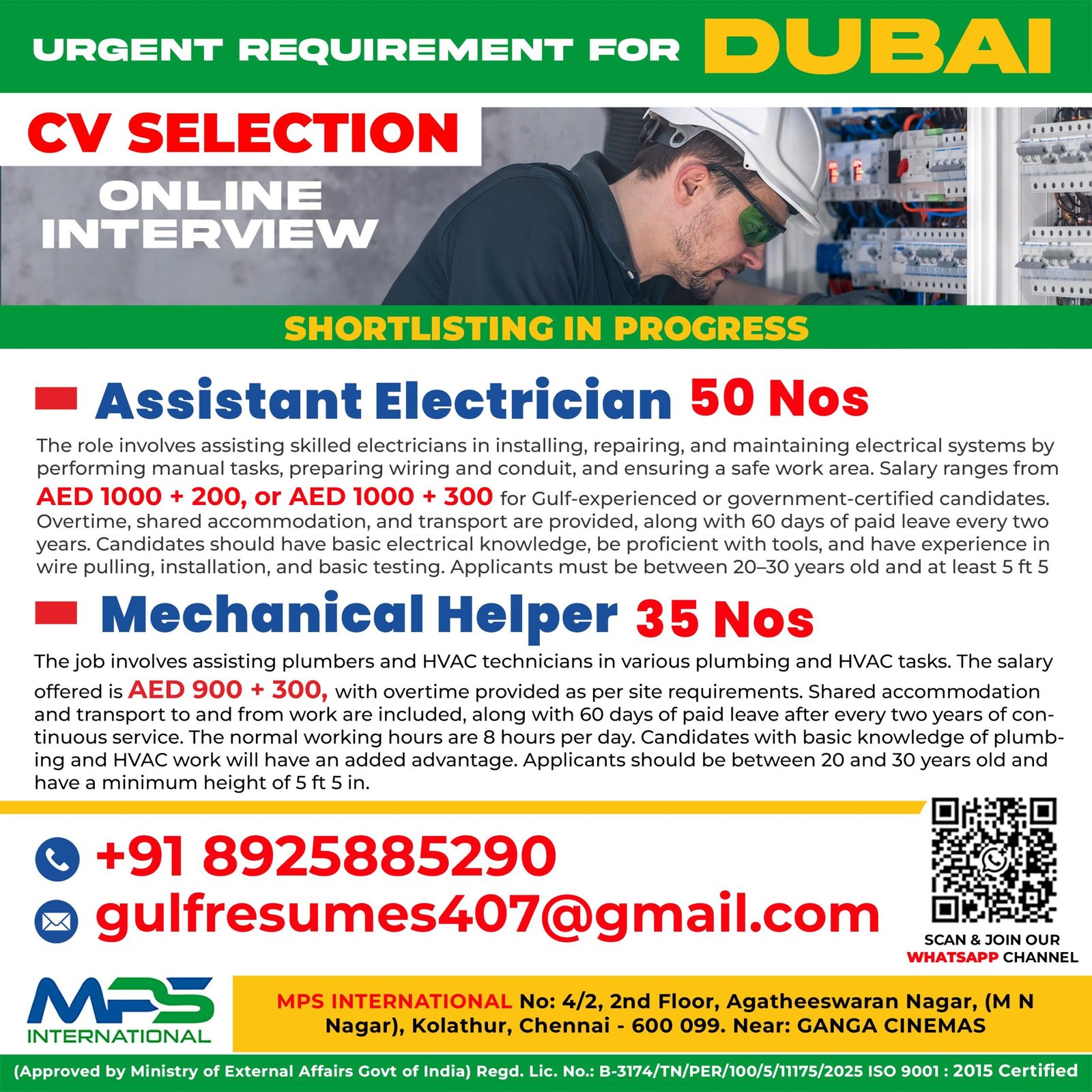 URGENT REQUIREMENT FOR DUBAI CV SELECTION ONLINE INTERVIEW Facility Management Dubai 2025-10-14 Application deadline closed. Job Overview Date Posted 2025-10-14 Location Dubai Expiration date -- Job Description ASSISTANT ELECTRICIAN MECHANICAL HELPERS Share this post Facebook Twitter LinkedIn Pinterest Photos Related Jobs URGENT REQUIREMENT FOR MALE CLEANERS :: EMPLOYMENT VISA :: ABU DHABI (UAE) Facility Management Dubai REQUIREMENTS FOR DUBAI – DIRECT CLIENT INTERVIEW ON 31.10.2025 (FRIDAY) AT CHENNAI Facility Management Dubai URGENT REQUIREMENT FOR MALE CLEANERS :: EMPLOYMENT VISA :: ABU DHABI (UAE) Facility Management Dubai URGENTLY REQUIRED FOR MOST LUXURIOUS / VVIP PROJECT IN SAUDI ARABIA CLIENT INTERVIEW IN CHENNAI ON 17.10.2025 Facility Management Saudi Arabia