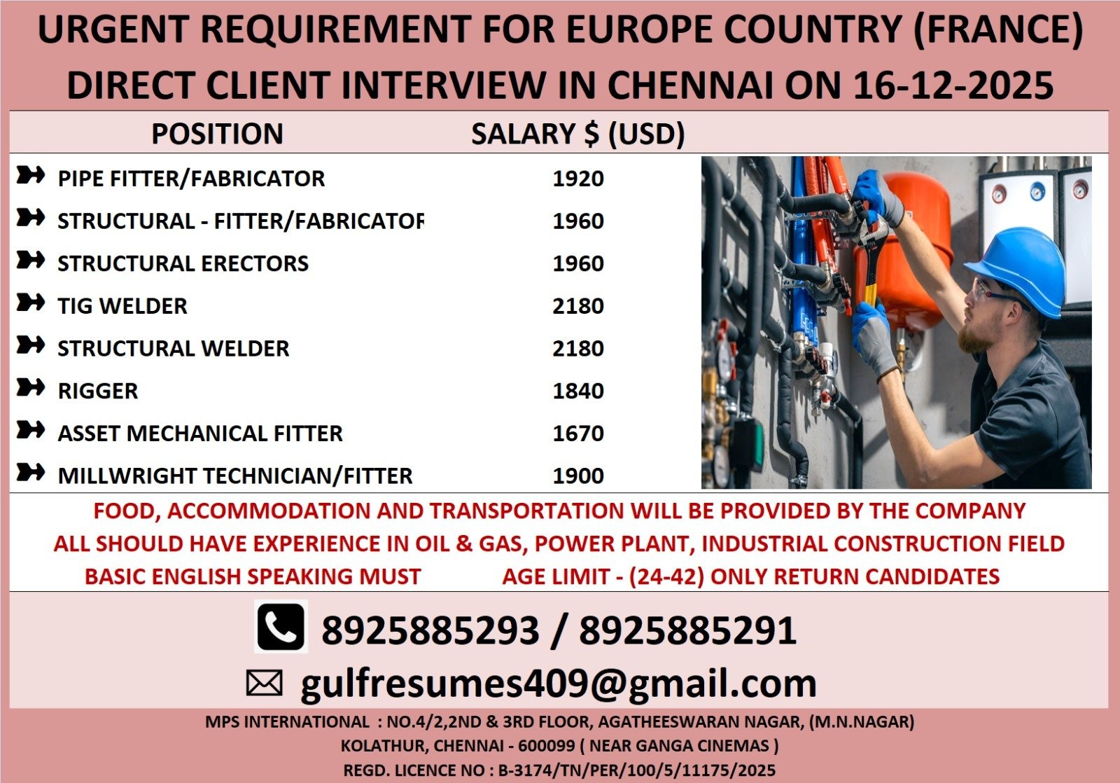 All should have experience in Oil & Gas, Power Plant, Industrial Construction field.