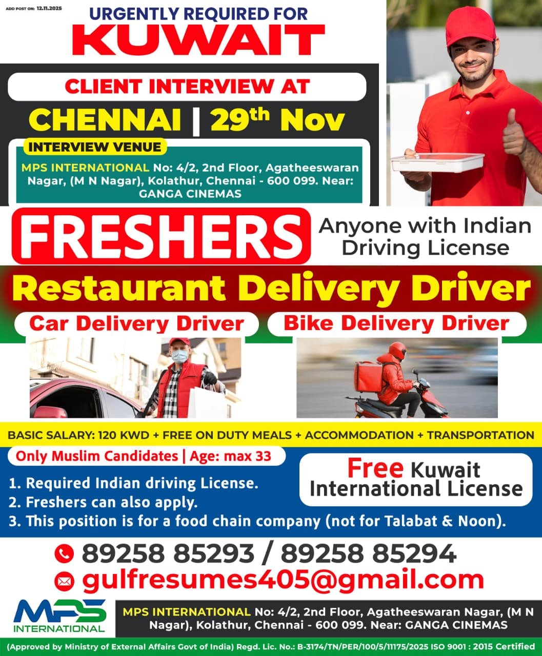 Basic Salary: 120 KWD + Free On Duty Meals + Accommodation + Transportation
