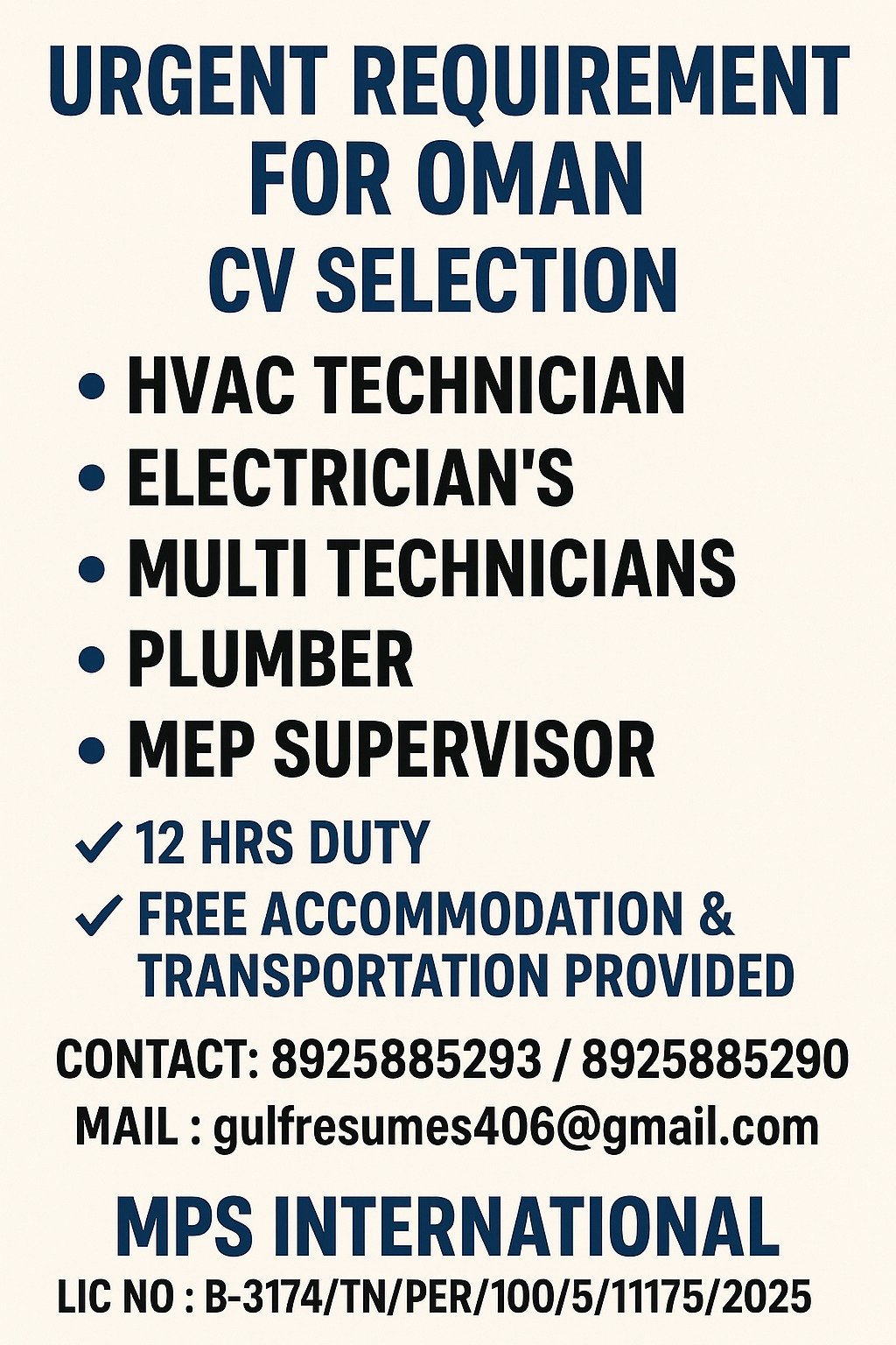 URGENT REQUIREMENT FOR OMAN Facility Management Oman 2025-09-15 Application deadline closed. Job Overview Date Posted 2025-09-15 Location Oman Expiration date -- Job Description CV SELECTIONS ONLINE INTERVIEW Share this post Facebook Twitter LinkedIn Pinterest Photos Related Jobs REQ FOR FACILITY MAINTENANCE COMPANY IN UAE CLIENT INTERVIEW IN TRICHY ON 06.10.25, NAGERCOIL ON 07.10.25 & VISAKHAPATNAM 09.10.2025 Facility Management United Arab Emirates (UAE) WE ARE HIRING FOR KSA FMCO COMPANY Facility Management Saudi Arabia REQUIREMENTS FOR SAUDI ARABIA – DIRECT CLIENT INTERVIEW ON 20.09.2025 (SATURDAY) AT CHENNAI Facility Management Saudi Arabia WANTED FOR A LEADING INSTALLATION & MAINTENANCE COMPANY – DUBAI | DIRECT CLIENT INTERVIEW ON 22nd SEPTEMBER – CHENNAI Facility Management United Arab Emirates (UAE)