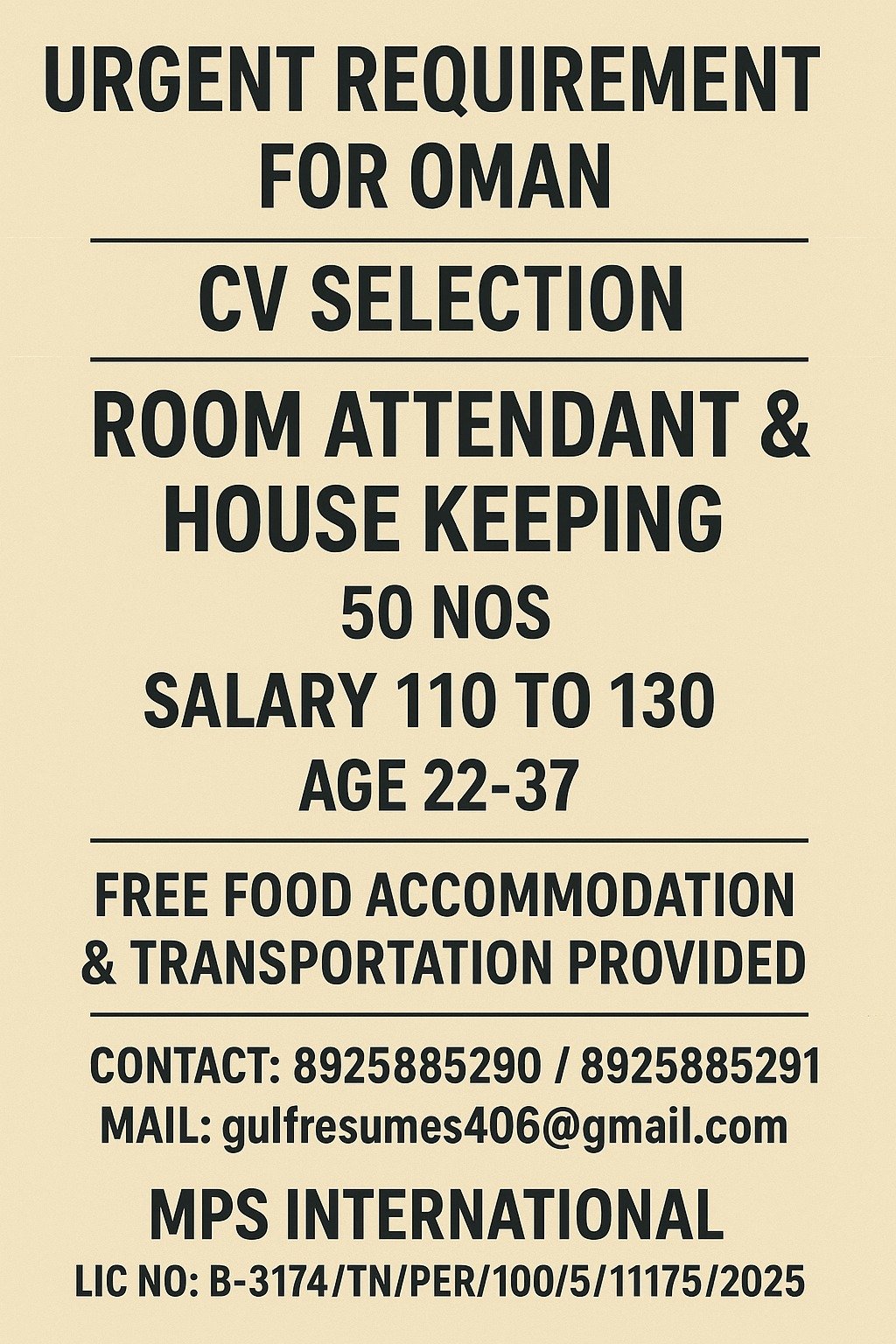 URGENT REQUIREMENT FOR OMAN Facility Management Oman 2025-09-15 Application deadline closed. Job Overview Date Posted 2025-09-15 Location Oman Expiration date -- Experience 1 Year Job Description CV SELECTION ONLINE INTERVIEW. Share this post Facebook Twitter LinkedIn Pinterest Photos Related Jobs REQUIREMENTS FOR DUBAI DIRECT CLIENT INTERVIEW ON 09.10.2025 (THURSDAY) AT CHENNAI Facility Management Dubai REQ FOR FACILITY MAINTENANCE COMPANY IN UAE CLIENT INTERVIEW IN TRICHY ON 06.10.25, NAGERCOIL ON 07.10.25 & VISAKHAPATNAM 09.10.2025 Facility Management United Arab Emirates (UAE) WE ARE HIRING FOR KSA FMCO COMPANY Facility Management Saudi Arabia REQUIREMENTS FOR SAUDI ARABIA – DIRECT CLIENT INTERVIEW ON 20.09.2025 (SATURDAY) AT CHENNAI Facility Management Saudi Arabia