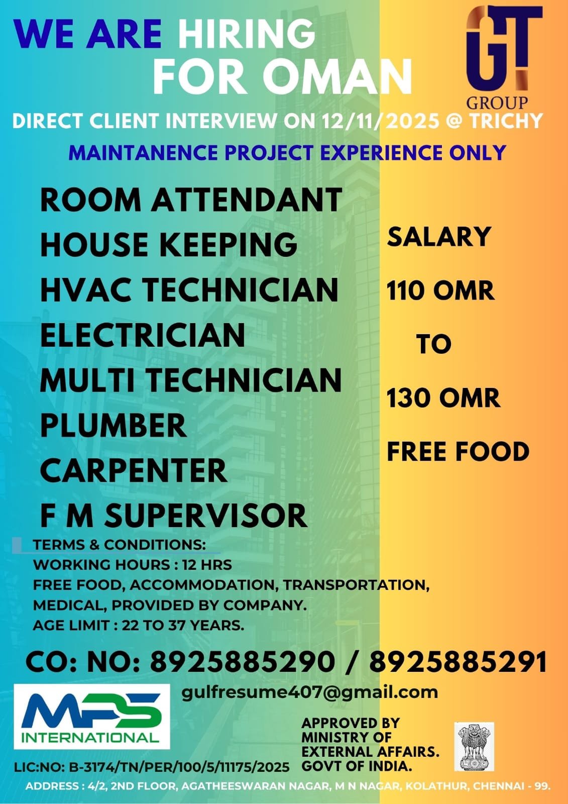 FREE FOOD, ACCOMMODATION, TRANSPORTATION, MEDICAL PROVIDED BY COMPANY.