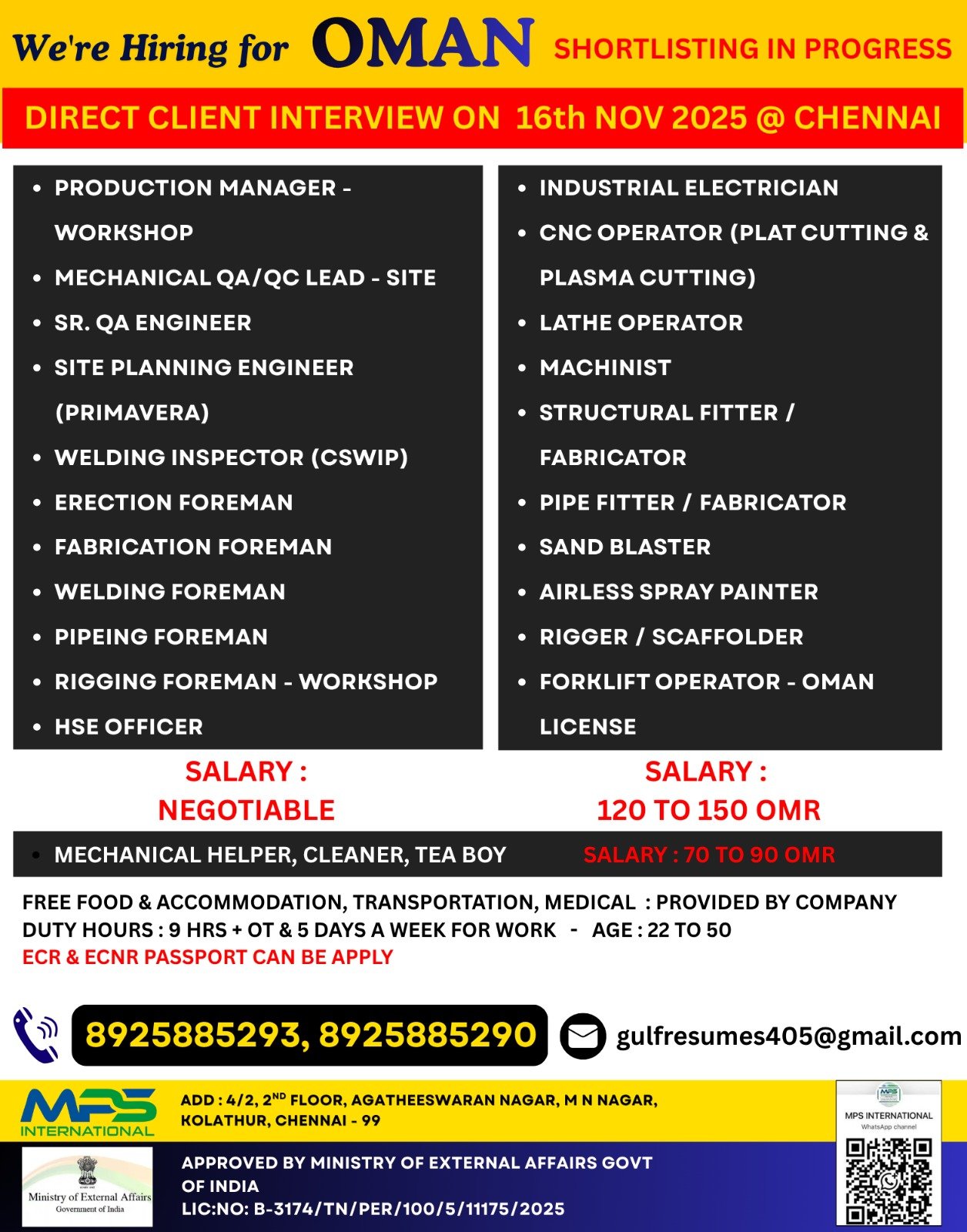 FREE FOOD & ACCOMMODATION, TRANSPORTATION, MEDICAL: PROVIDED BY COMPANY