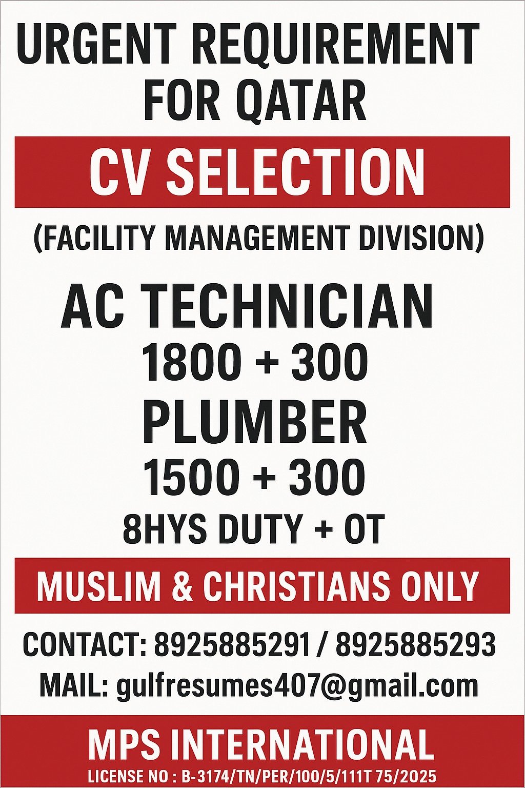 URGENT REQUIREMENT FOR QATAR ONLINE INTERVIEW Qatar 2025-09-25 Application deadline closed. Job Overview Date Posted 2025-09-25 Location Qatar Expiration date -- Job Description AC TECHNICIAN & PLUMBER Share this post Facebook Twitter LinkedIn Pinterest Photos