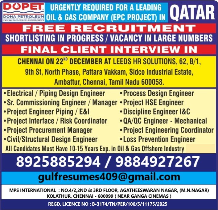 All candidates must have 10–15 years of experience in Oil & Gas Offshore Industry .
