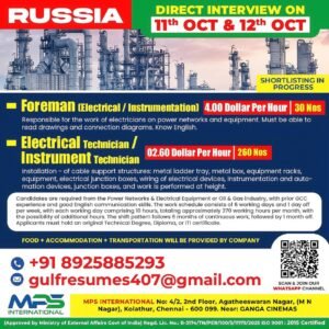 HIRING FOR RUSSIA DIRECT CLIENT INTERVIEW ON 11.10.2025 & 12.10.2025 AT CHENNAI Oil/Gas/Power/Energy/Refinery/Petrochemicals Russia 2025-10-06 Application deadline closed. Job Overview Date Posted 2025-10-06 Location Russia Expiration date -- Job Description OIL AND GAS EXP Share this post Facebook Twitter LinkedIn Pinterest Photos Related Jobs HEAVY AUTO ELECTRICIAN TECHNICIAN Oil/Gas/Power/Energy/Refinery/Petrochemicals Qatar FREE RECRUITMENT-TECHNICAL LABOR Oil/Gas/Power/Energy/Refinery/Petrochemicals Qatar FREE RECRUITMENT FOR UAE COUNTRY Oil/Gas/Power/Energy/Refinery/Petrochemicals United Arab Emirates (UAE) FREE RECRUITMENT FOR UAE COUNTRY Oil/Gas/Power/Energy/Refinery/Petrochemicals United Arab Emirates (UAE)