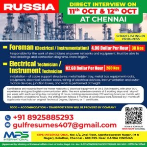 HIRING FOR RUSSIA DIRECT CLIENT INTERVIEW ON 11.10.2025 & 12.10.2025 AT CHENNAI Oil/Gas/Power/Energy/Refinery/Petrochemicals Russia 2025-09-29 Application deadline closed. Job Overview Date Posted 2025-09-29 Location Russia Expiration date -- Job Description OIL AND GAS EXP Share this post Facebook Twitter LinkedIn Pinterest Photos Related Jobs HEAVY AUTO ELECTRICIAN TECHNICIAN Oil/Gas/Power/Energy/Refinery/Petrochemicals Qatar FREE RECRUITMENT-TECHNICAL LABOR Oil/Gas/Power/Energy/Refinery/Petrochemicals Qatar FREE RECRUITMENT FOR UAE COUNTRY Oil/Gas/Power/Energy/Refinery/Petrochemicals United Arab Emirates (UAE) FREE RECRUITMENT FOR UAE COUNTRY Oil/Gas/Power/Energy/Refinery/Petrochemicals United Arab Emirates (UAE)