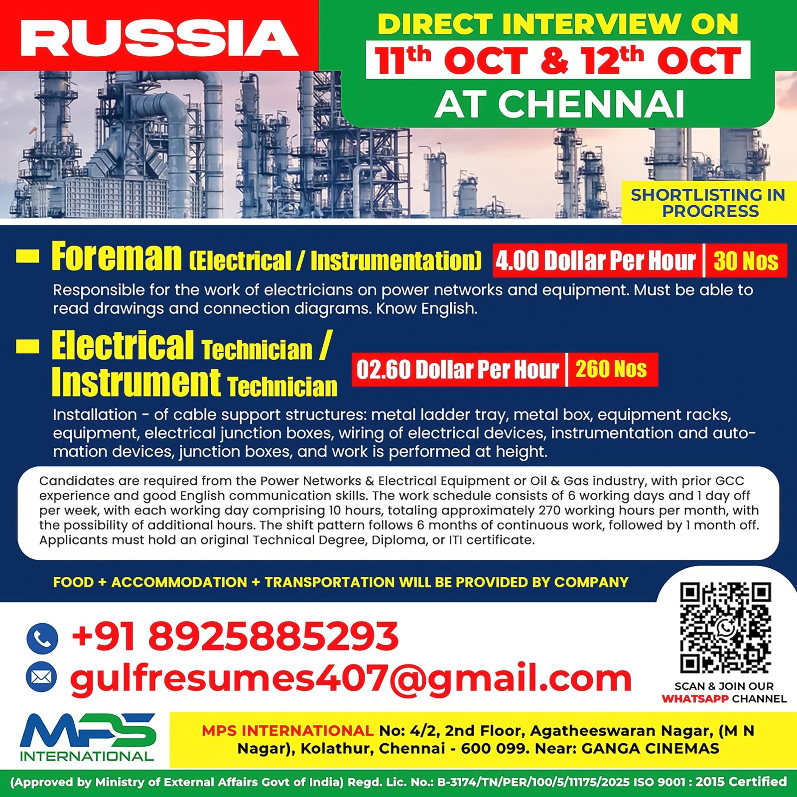 WALK-IN CLIENT’S FINAL INTERVIEW ON 01st OCT 2025 AT CHENNAI Oil/Gas/Power/Energy/Refinery/Petrochemicals Qatar