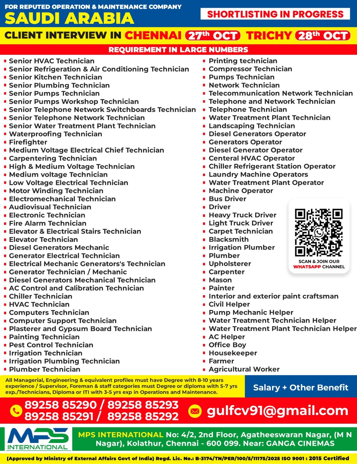 URGENLY REQUIRED FOR SAUDI ARABIA FOR REPUTED OPERATION AND MAINTENANCE COMPANY CLIENT INTERVIEW IN CHENNAI ON 27.10.2025 & TRICHY ON 28.10.2025 Facility Management Saudi Arabia