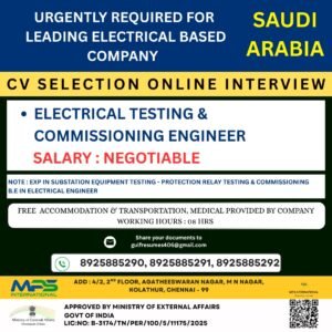 URGENTLY REQUIRED FOR LEADING ELECTRICAL BASED COMPANY SAUDI ARABIA Industrial Groups / Others Saudi Arabia 2025-10-23 Application deadline closed. Job Overview Date Posted 2025-10-23 Location Saudi Arabia Expiration date -- Job Description EXP IN SUBSTATION EQUIPMENT TESTING – PROTECTION RELAY TESTING & COMMISSIONING Share this post Facebook Twitter LinkedIn Pinterest Photos Related Jobs Hiring for LITHUANIA / LATVIA [EUROPE] Industrial Groups / Others Lithuania Hiring for LITHUANIA / LATVIA Industrial Groups / Others Lithuania Hiring for LITHUANIA / LATVIA [EUROPEAN COUNTRY] Industrial Groups / Others Lithuania Hiring for LITHUANIA / LATVIA [EUROPE] Industrial Groups / Others Lithuania