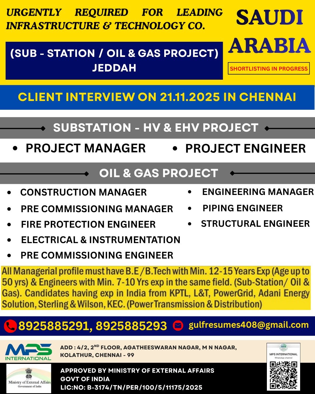All Managerial profile must have B.E / B.Tech with Min. 12–15 Years Exp (Age up to 50 yrs) & Engineers with Min. 7–10 Yrs exp in the same field. (Sub-Station/ Oil & Gas). Candidates having exp in India from KPTL, L&T, Power Grid, Adani Energy Solution, Sterling & Wilson, KEC. (Power Transmission & Distribution)