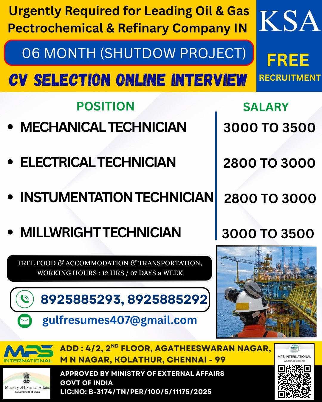 URGENTLY REQUIRED FOR LEADING OIL AND GAS COMPANY IN SAUDI ARABIA CV SELECTION Oil/Gas/Power/Energy/Refinery/Petrochemicals Saudi Arabia 2025-10-14 Application deadline closed. Job Overview Date Posted 2025-10-14 Location Saudi Arabia Expiration date -- Job Description OIL AND GAS PETROCHEMICAL & REFINERY 6TH MONTH SHUTDOWN PROJECT Share this post Facebook Twitter LinkedIn Pinterest Photos Related Jobs FREE RECRUITMENT FOR QATAR COUNTRY Oil/Gas/Power/Energy/Refinery/Petrochemicals Qatar INSTRUMENT TECHNICIAN Oil/Gas/Power/Energy/Refinery/Petrochemicals United Arab Emirates (UAE) LIFTING / RIGGING ENGINEER Oil/Gas/Power/Energy/Refinery/Petrochemicals United Arab Emirates (UAE) INSTRUMENT TECHNICIAN Oil/Gas/Power/Energy/Refinery/Petrochemicals United Arab Emirates (UAE)