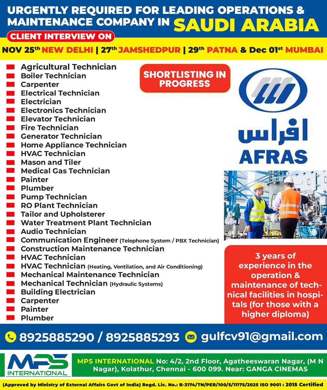 URGENTLY REQUIRED FOR LEADING OPERATIONS & MAINTENANCE COMPANY IN SAUDI ARABIA CLIENT INTERVIEW ON 25.11.2025 NEW DELHI ON 27.11.2025 JAMSHEDPUR ON 29.11.2025 PATNA & 01.12.2025 MUMBAI