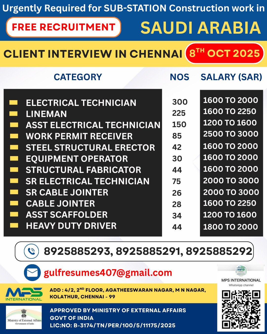 WE ARE HIRING FOR SAUDI ARABIA CLIENT INTERVIEW IN CHENNAI ON 08.10.2025 & 09.10.2025 Industrial Groups / Others Saudi Arabia