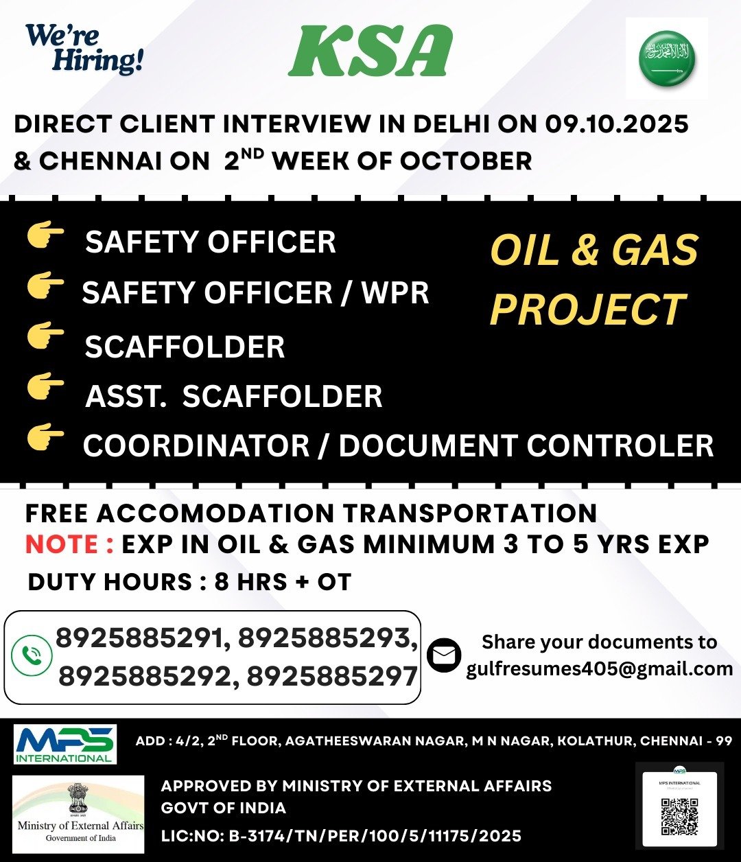 WE ARE HIRING FOR KSA DIRECT CLIENT INTERVIEW IN DELHI ON 09.10.2025 & CHENNAI ON 2ND WEEK OF OCTOBER 2025 Oil/Gas/Power/Energy/Refinery/Petrochemicals Saudi Arabia 2025-09-19 Application deadline closed. Job Overview Date Posted 2025-09-19 Location Saudi Arabia Expiration date -- Job Description OIL AND GAS EXP Share this post Facebook Twitter LinkedIn Pinterest Photos Related Jobs WANTED FOR A LEADING OIL & GAS PLANT MAINTENANCE COMPANY – QATAR / DIRECT CLIENT INTERVIEW ON 4TH OCTOBER – CHENNAI Oil/Gas/Power/Energy/Refinery/Petrochemicals Qatar WALK-IN CLIENT’S FINAL INTERVIEW ON 01st OCT 2025 AT CHENNAI Oil/Gas/Power/Energy/Refinery/Petrochemicals Qatar MECHANICAL TECHNICIAN / ELECTRICAL TECHNICIAN / ANALYZER TECHNICIAN Oil/Gas/Power/Energy/Refinery/Petrochemicals Qatar SINGLE POINT AUTHORITY / LIFTING (SPA) & APLO Oil/Gas/Power/Energy/Refinery/Petrochemicals United Arab Emirates (UAE)