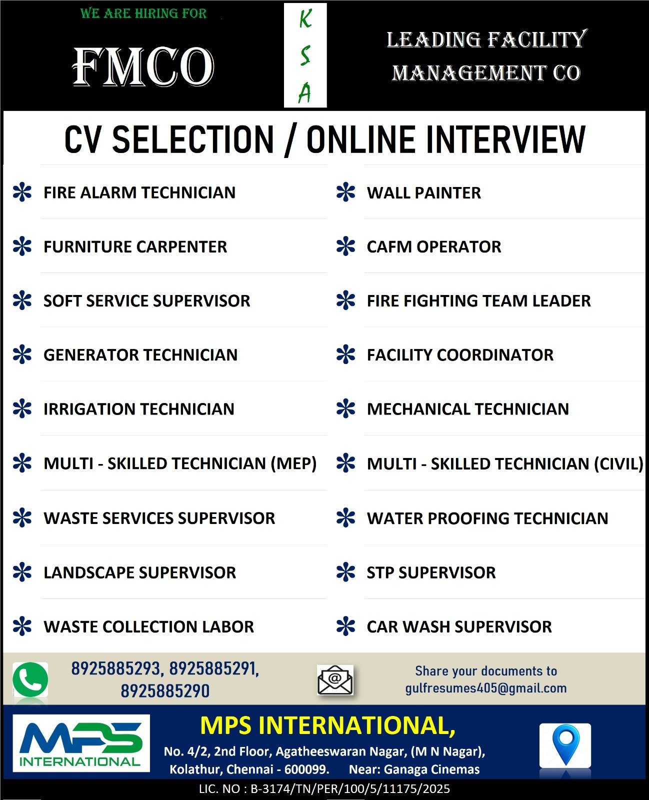REQUIREMENTS FOR SAUDI ARABIA – DIRECT CLIENT INTERVIEW ON 20.09.2025 (SATURDAY) AT CHENNAI Facility Management Saudi Arabia