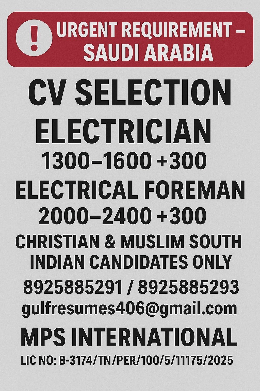 WE ARE HIRING FOR SAUDI ARABIA CV SELECTION Industrial Groups / Others Saudi Arabia 2025-09-19 Application deadline closed. Job Overview Date Posted 2025-09-19 Location Saudi Arabia Expiration date -- Job Description CHRISTIAN & MUSLIM SOUTH INDIAN CANDIDATES ONLY Share this post Facebook Twitter LinkedIn Pinterest Photos Related Jobs WANTED FOR A LEADING WATER TREATMENT PLANT COMPANY – QATAR / DIRECT CLIENT INTERVIEW ON 5TH OCTOBER – TRICHY Industrial Groups / Others Doha WANTED FOR A LEADING INSTALLATION & MAINTENANCE COMPANY – DUBAI & BAHRAIN | DIRECT CLIENT INTERVIEW ON 16th SEPTEMBER – TRICHY Industrial Groups / Others Dubai WANTED FOR A LEADING OIL & GAS COMPANY ( FOR PETROL STATION) – DUBAI | DIRECT CLIENT INTERVIEW ON 5th SEPTEMBER – TRICHY Industrial Groups / Others United Arab Emirates (UAE) WANTED FOR A LEADING OIL & GAS COMPANY ( FOR PETROL STATION) – DUBAI | DIRECT CLIENT INTERVIEW ON 5th SEPTEMBER – TRICHY Industrial Groups / Others United Arab Emirates (UAE)