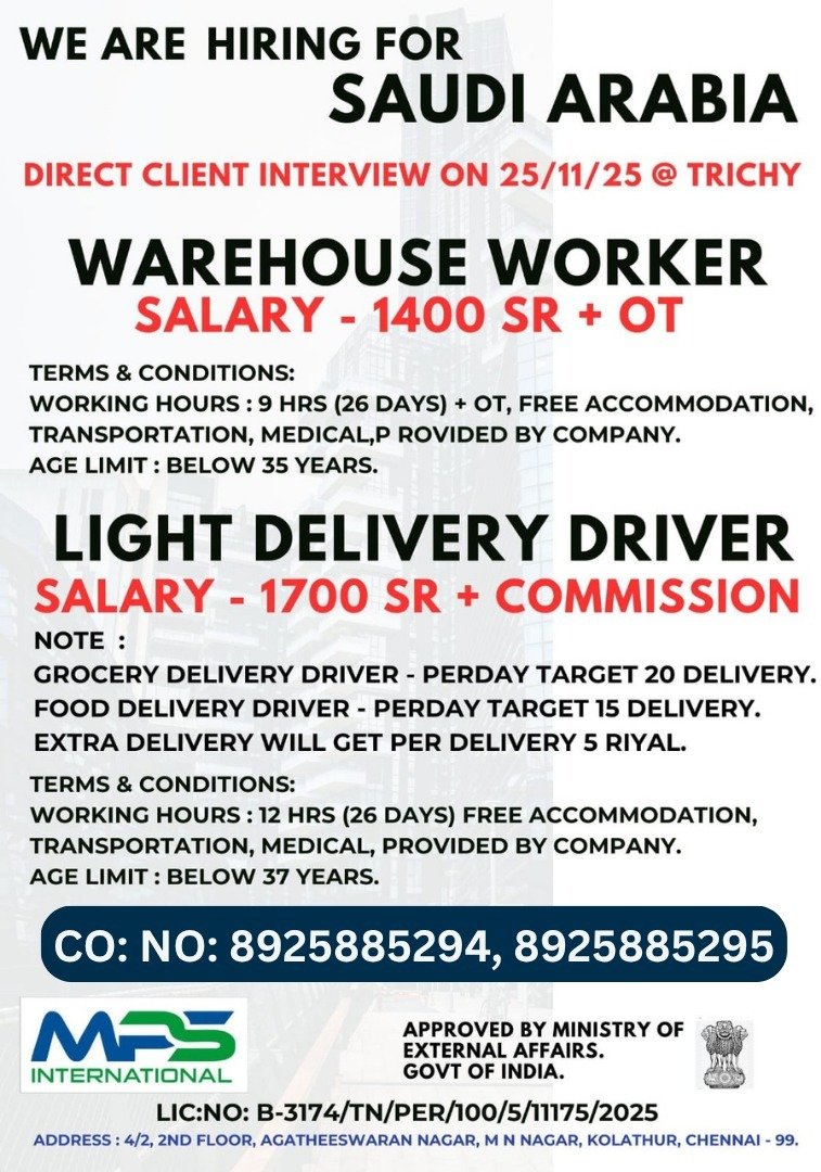 WORKING HOURS: 9 HRS (26 DAYS) + OT, FREE ACCOMMODATION, TRANSPORTATION, MEDICAL, PROVIDED BY COMPANY.