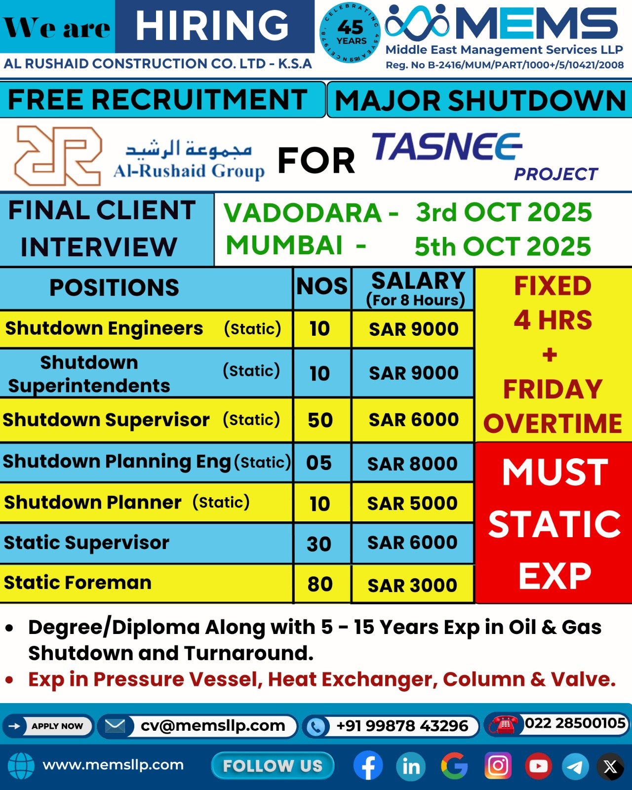 hashtag#ShutdownJobs hashtag#SaudiJobs hashtag#OilAndGasCareers hashtag#JobsInSaudi hashtag#gulfjobs hashtag#MEMSHiring hashtag#RecruitmentAgency hashtag#workinsaudiarabia